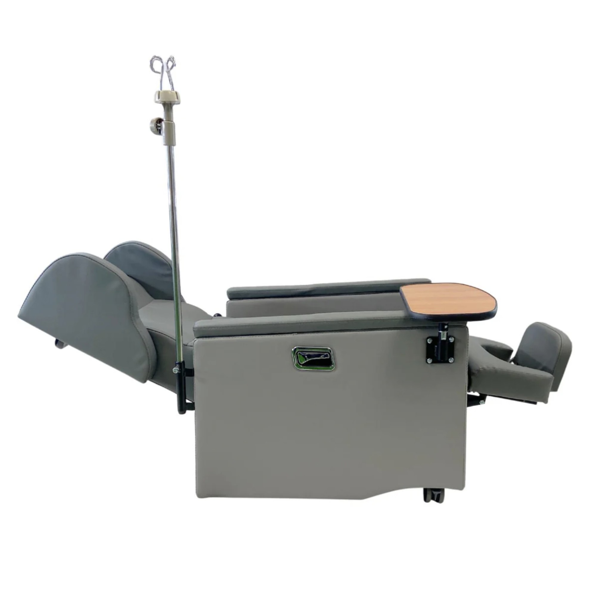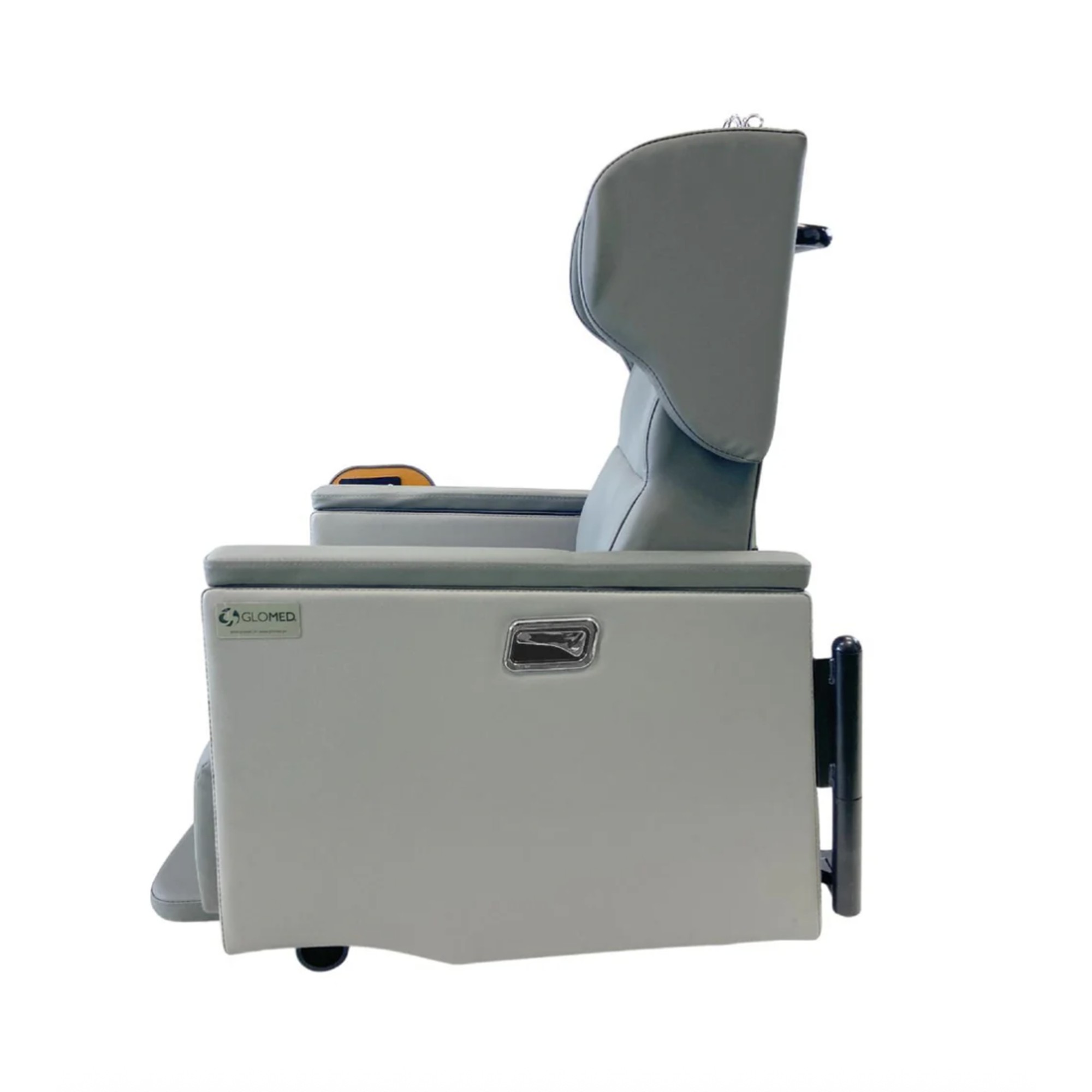 Gracias a su mecanismo de reclinación neumático, permite ajustar el respaldo y el soporte de piernas en múltiples posiciones, alcanzando hasta 180° de reclinación. Además, incorpora una barra de traslado en el respaldo para facilitar su movilidad, junto con portasuero, mesa de alimentación, brazos de altura regulable y un brazo derecho abatible que mejora el acceso y la asistencia del paciente.