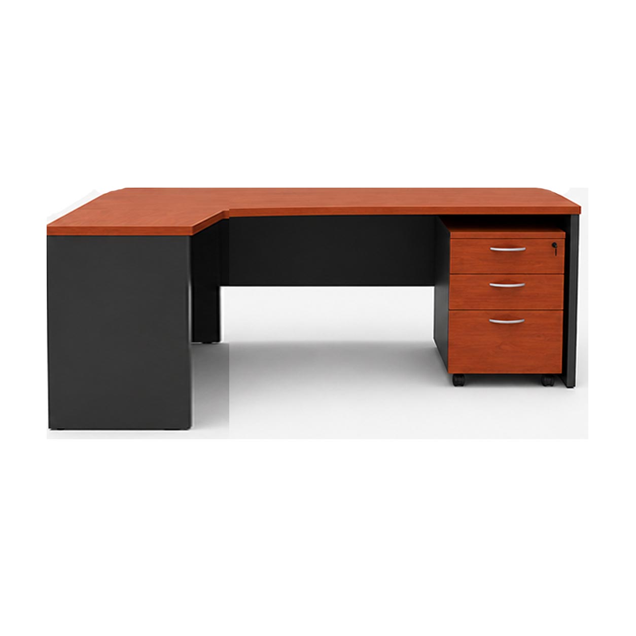 La Estación de trabajo curva cuenta con diseño ergonómico y estructura robusta. Además, incorpora cajonera pedestal con dos cajones estándar y un cajón kardex para almacenamiento.