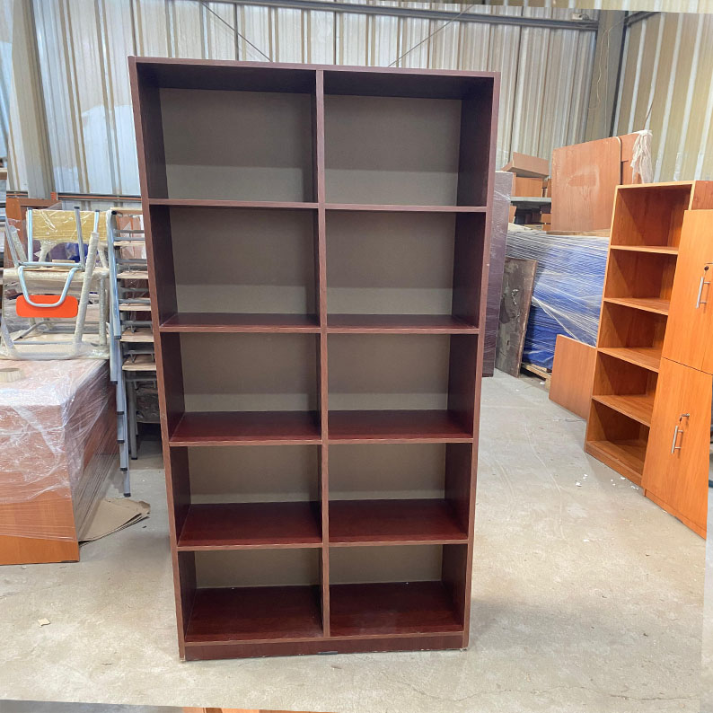 Práctico estante repisero de dos columnas con diez repisas, realizado en madera.