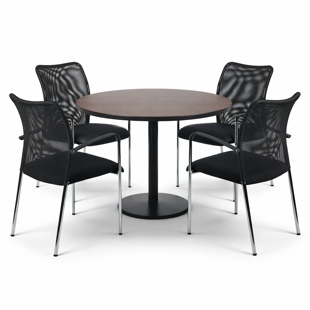 Optimiza tus espacios con este conjunto de mesa redonda y sillas Strong, diseñado para entornos de alto tráfico como minería, casinos y salas de reunión. Su estructura metálica resistente, junto a su cubierta disponible en terminación, cerezo, peral o blanca, ofrece durabilidad, fácil limpieza y una estética profesional ideal para uso intensivo. medida de la mesa 120 cm