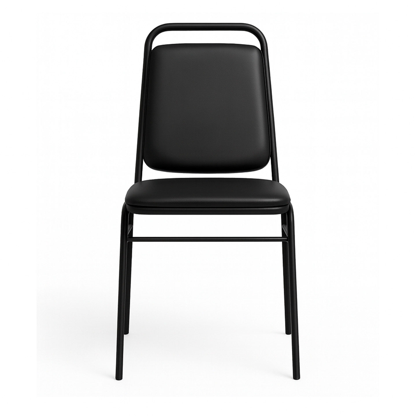 Tanto el respaldo como el asiento están revestidos en tela de alta resistencia, fácil de limpiar y seleccionada para mantener la estética profesional sin comprometer la funcionalidad. Su estructura de acero reforzado pintada en negro garantiza estabilidad, soporte seguro y mayor durabilidad frente al desgaste.